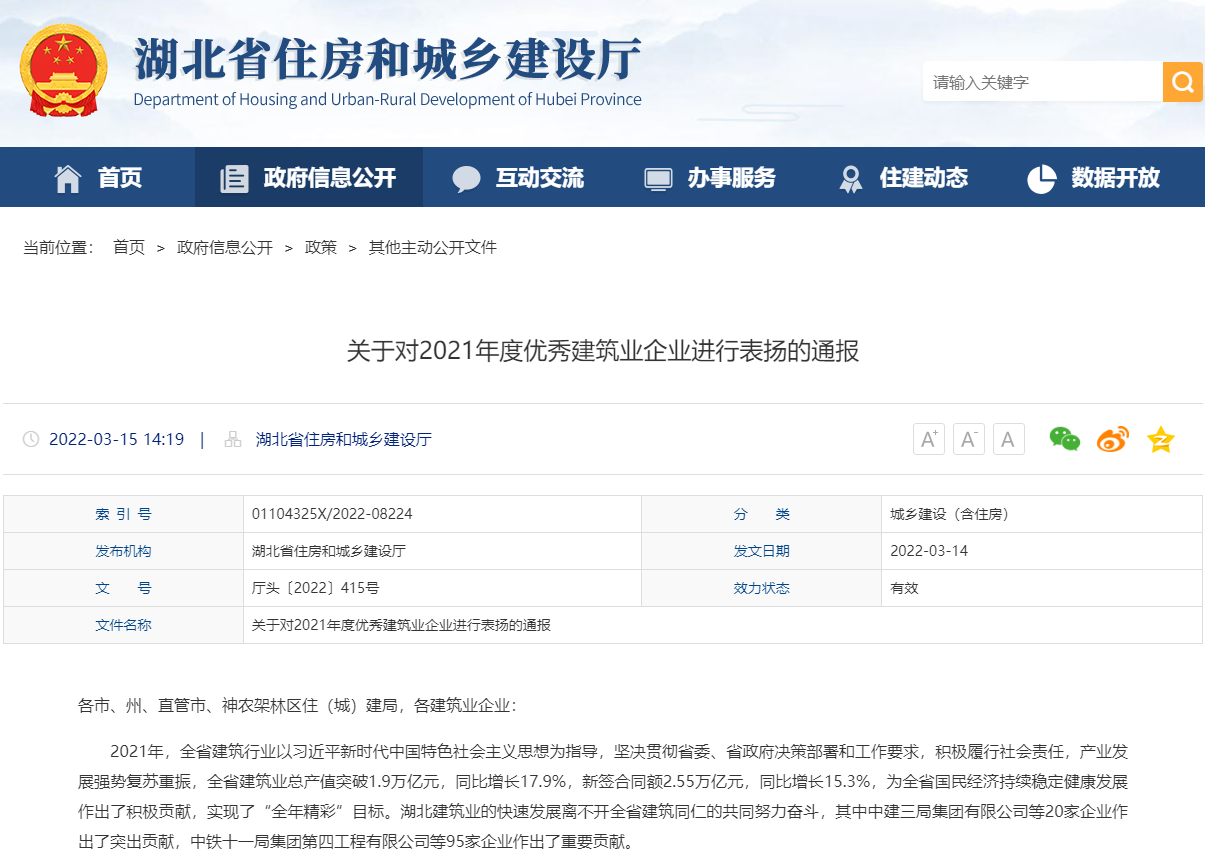 ? ? 3月15日,湖北省住建廳公布115家優(yōu)秀建筑業(yè)企業(yè)名單,揭曉2021年度突出貢獻(xiàn)企業(yè)和重要企業(yè)評(píng)選結(jié)果,漢陽(yáng)市政獲評(píng)“2021年度重要貢獻(xiàn)企業(yè)”,獲通報(bào)表?yè)P(yáng)。